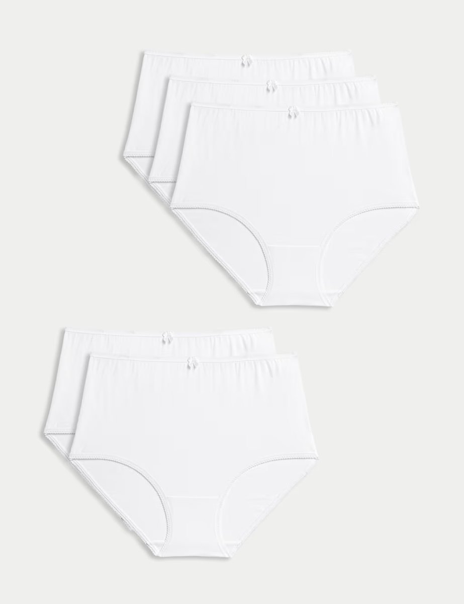 These M&S high-rise briefs feature a full-coverage cut that flatters your tummy with a smoothing effect. Made from pure cotton with added stretch, these comfortable briefs offer day-long comfort while maintaining their shape. The pack includes five different pantie styles, all finished with StayNew™.