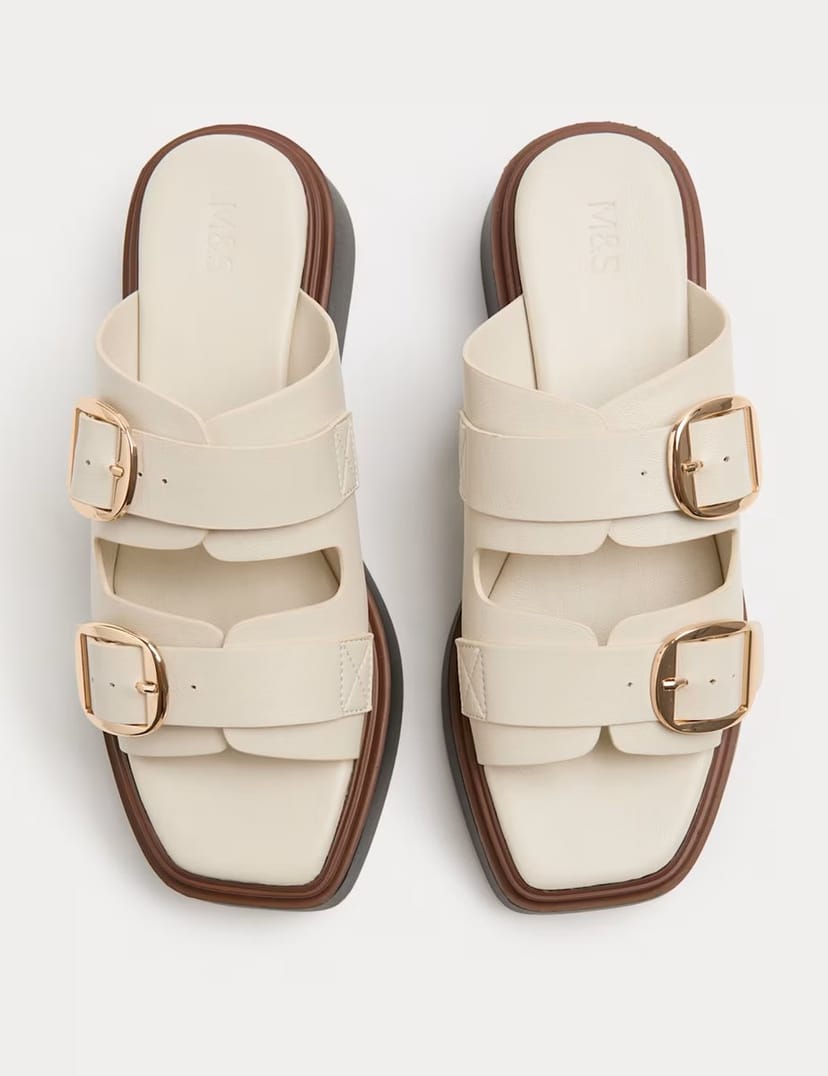 The M&S Chic Double Buckle Flatform Mules in White is available in sizes 3, 4, 5, 6, 7, 8.