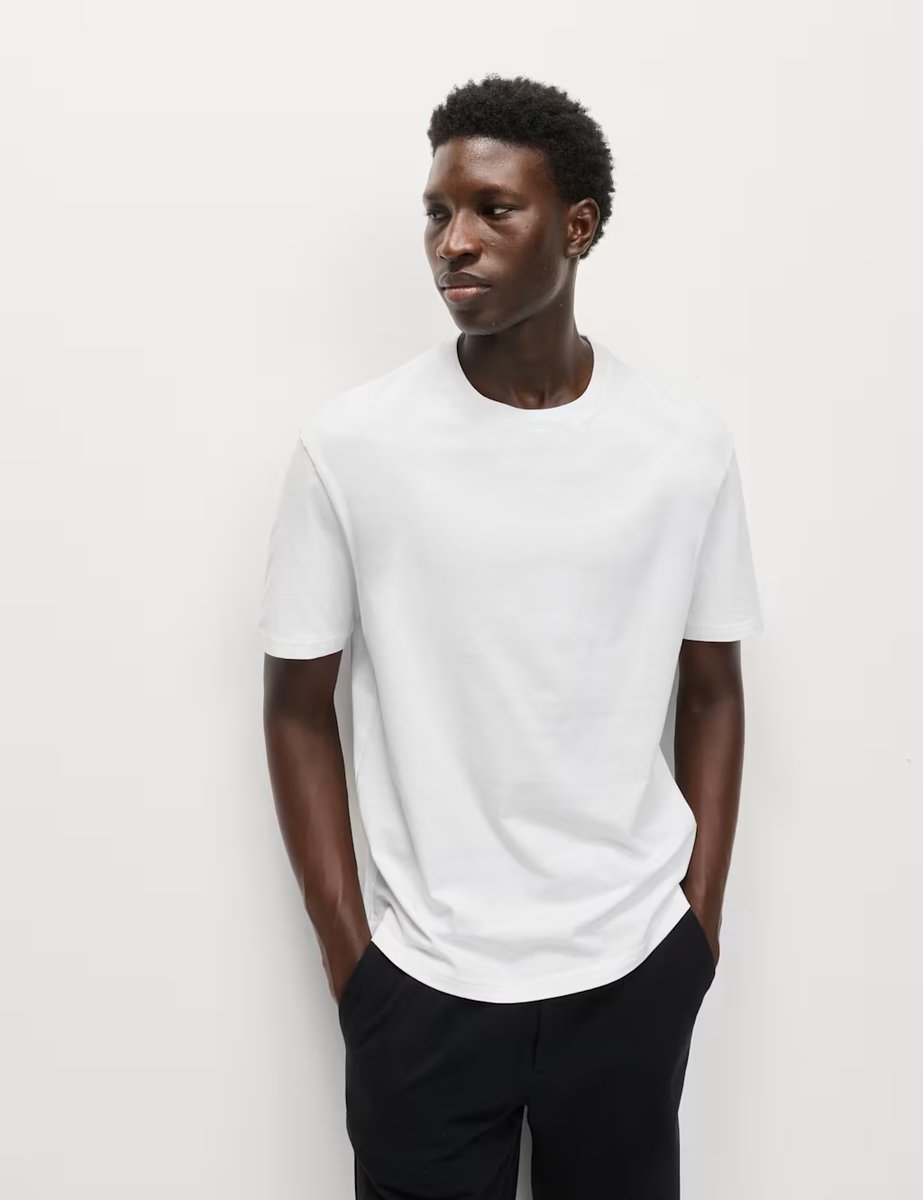 The M&S Relaxed Fit Pure Cotton T-Shirt in White is available in sizes LLNG, LREG, MREG, SREG, XLLNG, XLREG, XXLLNG, XXLREG, XXXLLNG, XXXLREG.