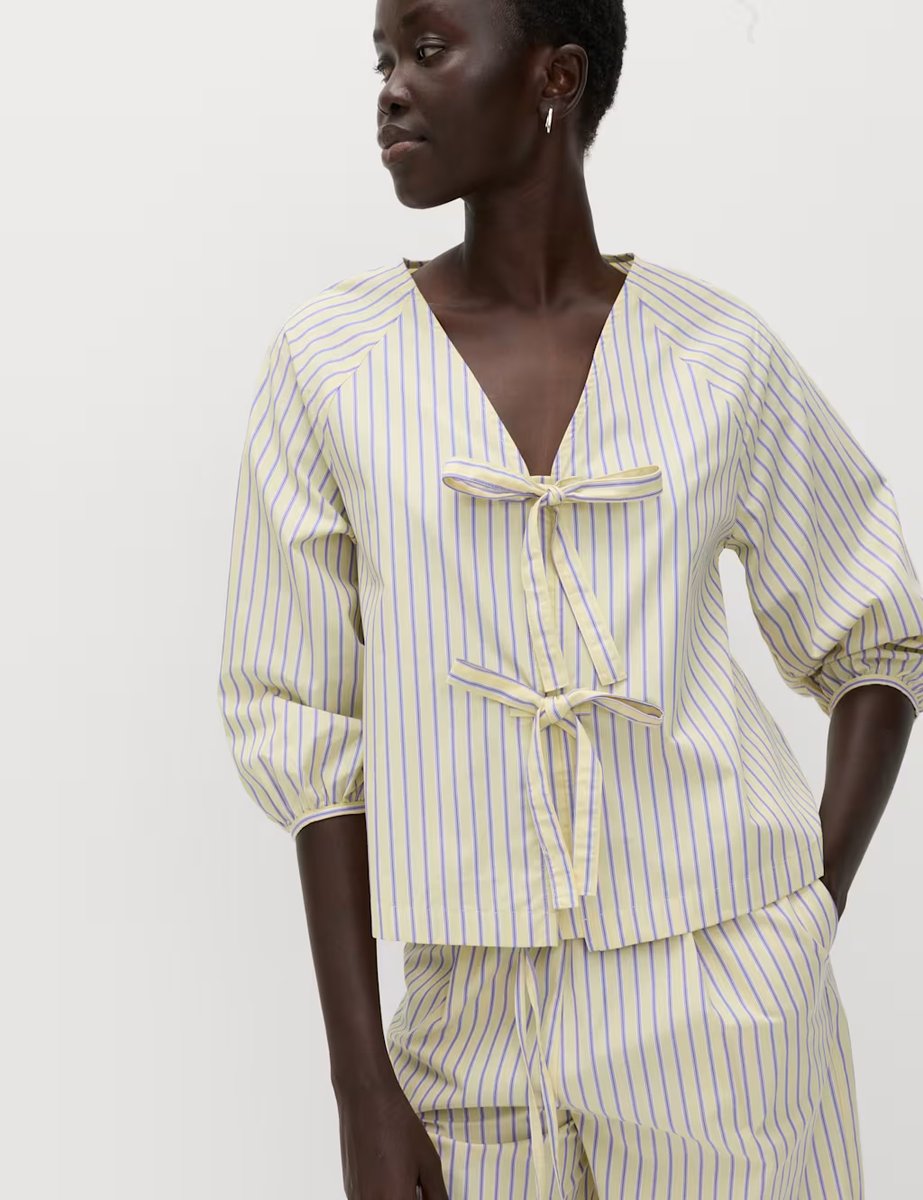 The M&S Pure Cotton Striped Tie Front Blouse Yellow Mix is ideal for casual, smart-casual.