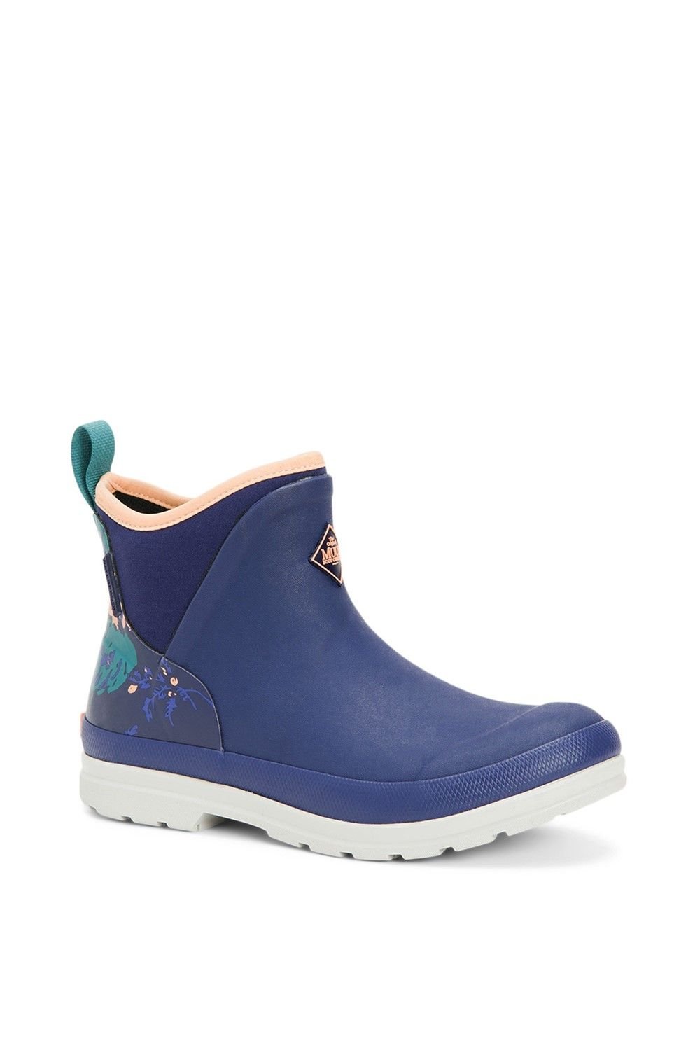 Stylish Navy Muck Boots Originals ankle wellingtons with a floral print and neoprene bootie. Perfect for rainy days with their 100% waterproof design.