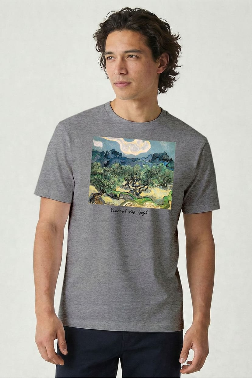 Elevate your everyday wardrobe with this grey t-shirt featuring an iconic artwork by Vincent Van Gogh. The Olive Trees design adds a touch of timeless culture to a modern streetwear staple. Perfect for casual wear.