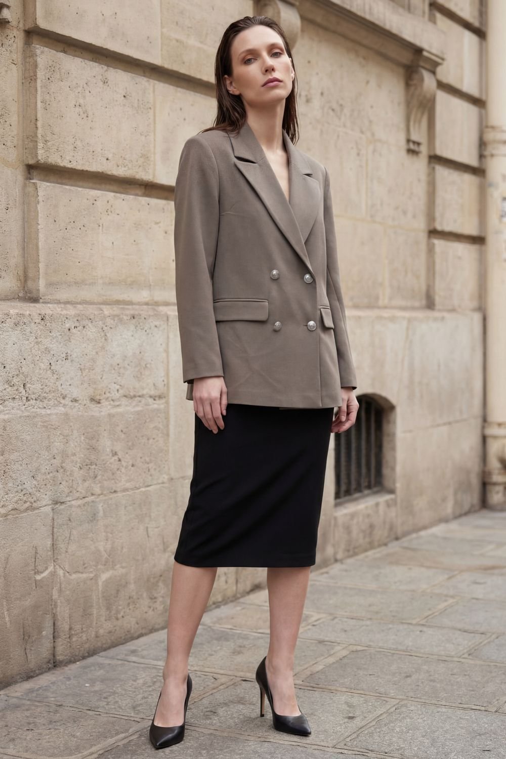 Elegant khaki blazer jacket crafted from a blend of polyester, viscose, and elastane. Features a distinctive jacket collar and button closure for a polished professional look.