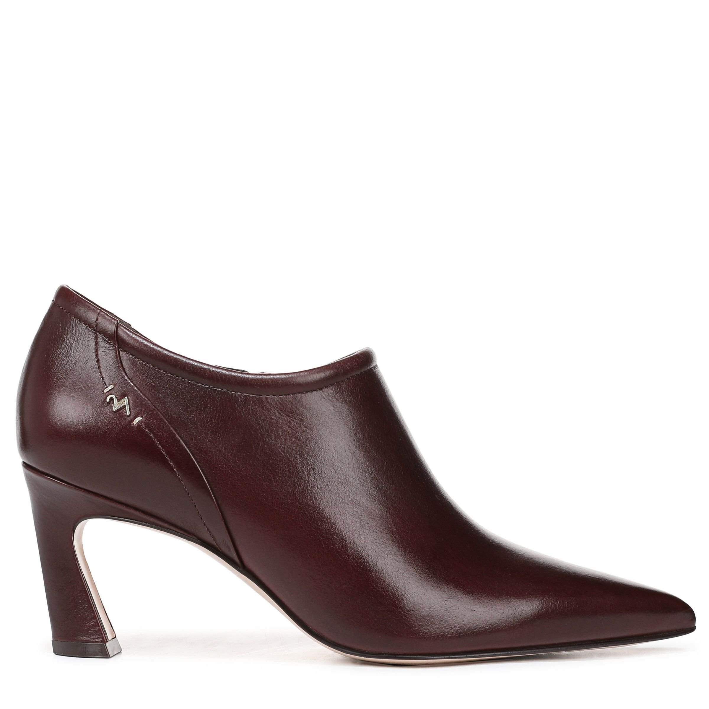 Stylish wine leather ankle boots with a pointed-toe design and a slender high heel. Features a sleek silhouette and a zip closure for easy wear. Perfect for formal and semi-formal occasions.