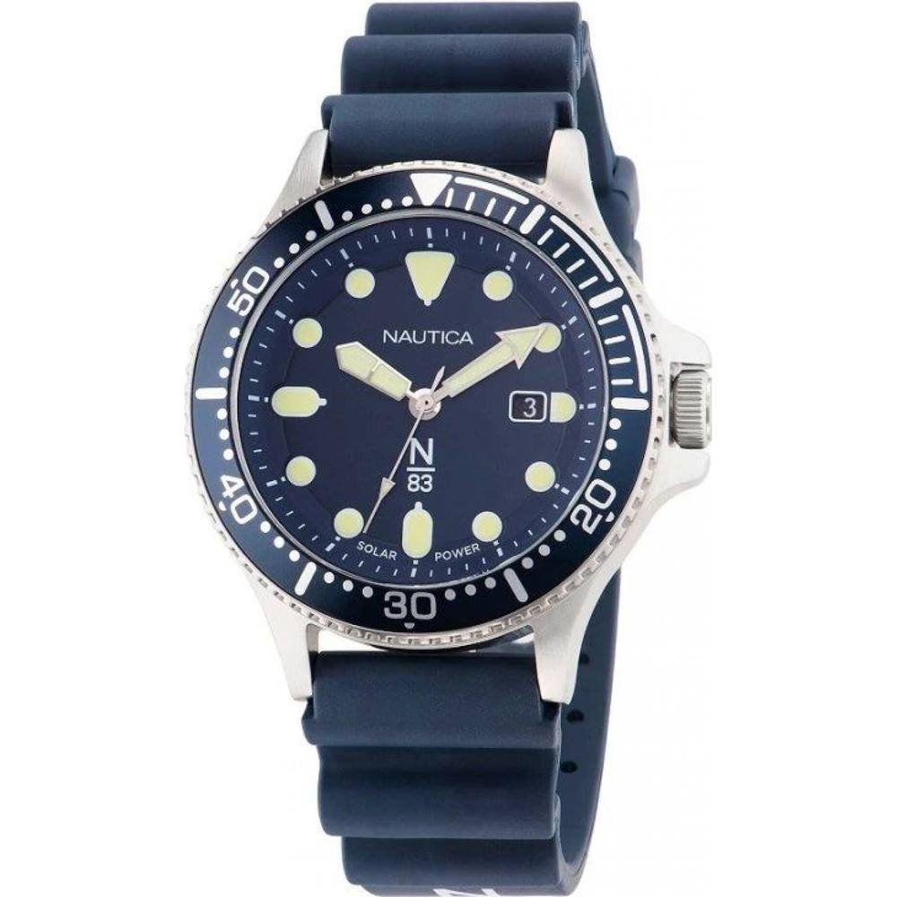 Stylish blue quartz watch by Nautica, featuring a 43mm case and a blue rubber strap. Ideal for everyday wear with its solar-powered functionality.