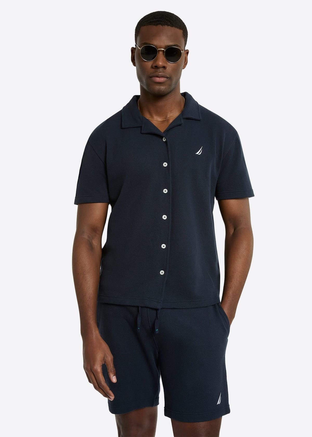 Stylish dark navy short sleeve shirt from Nautica crafted from high-quality loopback pique cotton. Features a button fastening and twin stitch detailing. Embroidered Nautica logo on the chest.
