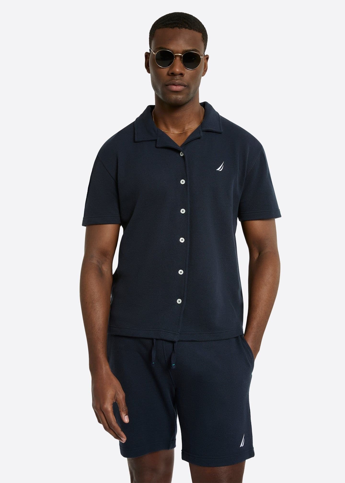 “Pair with dark navy shorts and white sneakers for a casual summer look.”