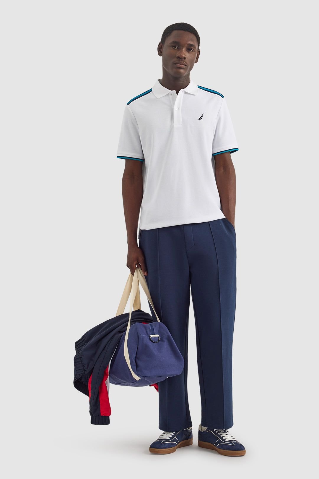 Stylish white polo shirt from Nautica crafted from a breathable cotton-blend pique. Features subtle tipping at the collar and cuffs, woven debossed tape, and a clean embroidered logo. Perfect for a smart yet casual look.