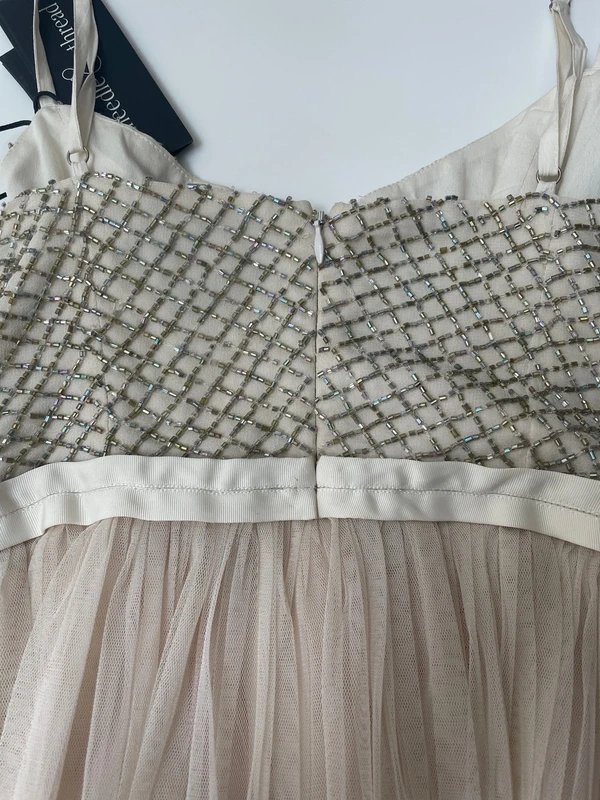 Cream Tulle Ballerina Dress — the perfect choice for special occasions. This ballerina style dress features adjustable shoulder straps, a dusky champagne colour, and sequins for a touch of sparkle. Crafted from lightweight tulle with a fully lined construction, it offers a delicate and ethereal look. Ideal for weddings, evening events, and formal gatherings.
