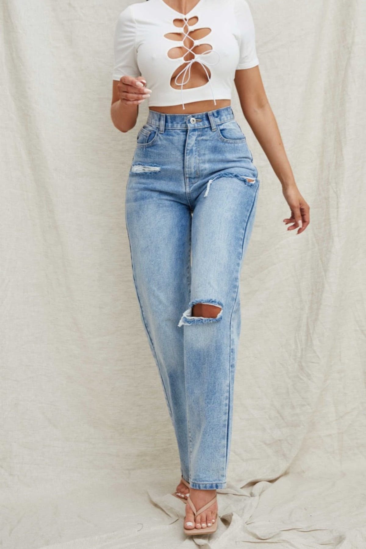 Trendy light blue high-waisted ripped straight-leg jeans with a distressed finish. Perfect for a casual yet stylish look.