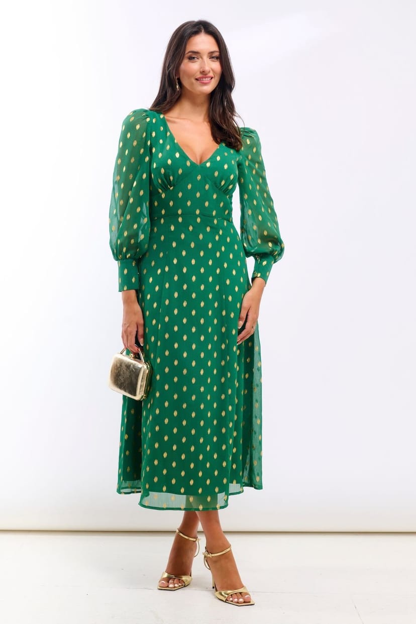Glisten in style with our Green Foil Midi Dress the perfect style for when you want effortless glamour. Designed with a flattering V-neckline, semi-sheer sleeves, and a fitted bodice that flows into a fluid midi skirt, this dress is finished with all-over gold foil spots that catch the light beautifully.