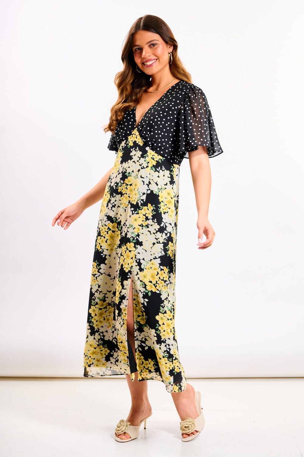 Playful vintage-inspired midi dress with a unique mix of classic polka dots and vibrant florals. The contrast of the dotty mesh bodice and floaty floral skirt creates a flattering silhouette, while the flutter sleeves add a touch of drama.