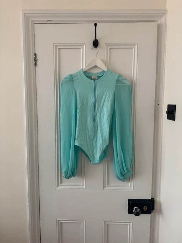 The Never Fully Dressed Turquoise Chiffon Balloon Sleeve Bodysuit is available in sizes S.