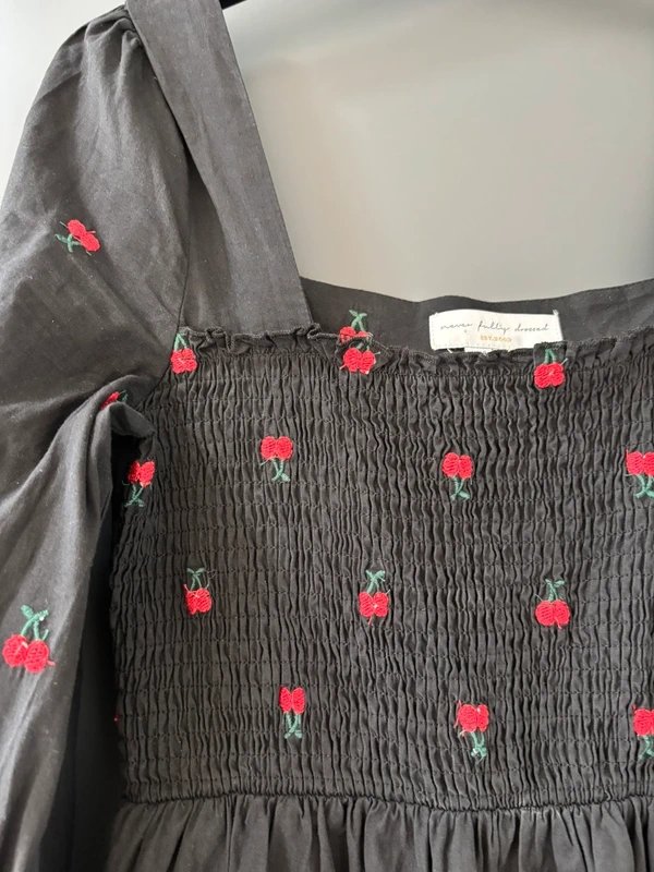 Gorgeous size 8 dress from ‘Never Fully Dressed’. Black with red embroidered cherries throughout. Shirred bust, long sleeves with elastic which can be worn full length or three quarter. Lots of volume in the skirt. Perfect for spring and summer.