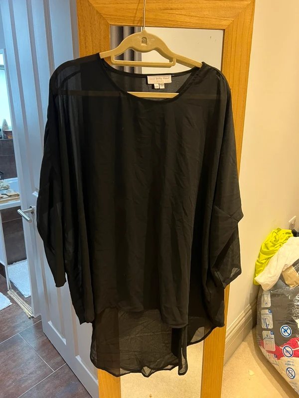 Black See-through Chiffon Top — perfect for layering over leather leggings or trousers. Designed in black, this hi-low top features a sheer chiffon fabric with a lightweight and airy feel. Ideal for casual wear or adding a touch of elegance to your outfits. Includes a full-length jersey slip for comfort and coverage.