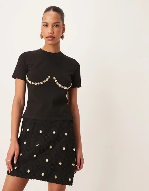 This black crochet shell skirt features a delicate crochet design with a full skirt. Perfect for adding a touch of elegance to any outfit.