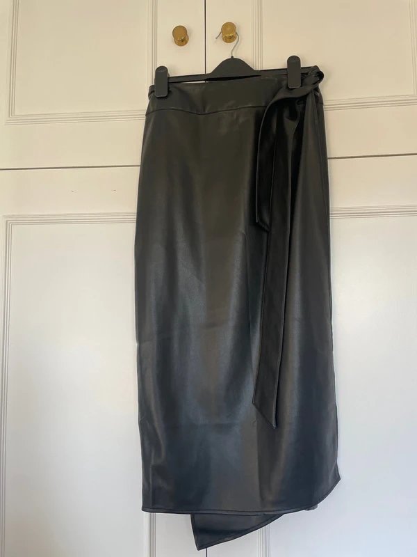 Black Vegan Leather Wrap Skirt — a sleek and versatile addition to your wardrobe. This one-size wrap skirt features an adjustable tie waist for a flexible fit and a flattering wrap style with hidden popper fastening. Crafted from vegan leather, it offers a luxurious look and feel. Perfect for both casual and formal occasions.