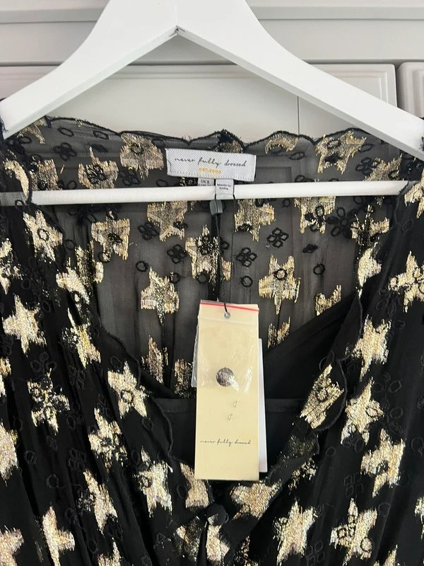 Black Sequin Party Dress — perfect for festive occasions like Christmas parties. This long-sleeve dress features a sheer lace overlay with gold sequin embellishments for a glamorous look. Crafted from lightweight sheer chiffon with subtle shimmer, it catches the light beautifully. Includes a full-length jersey slip lining for comfort and coverage.
