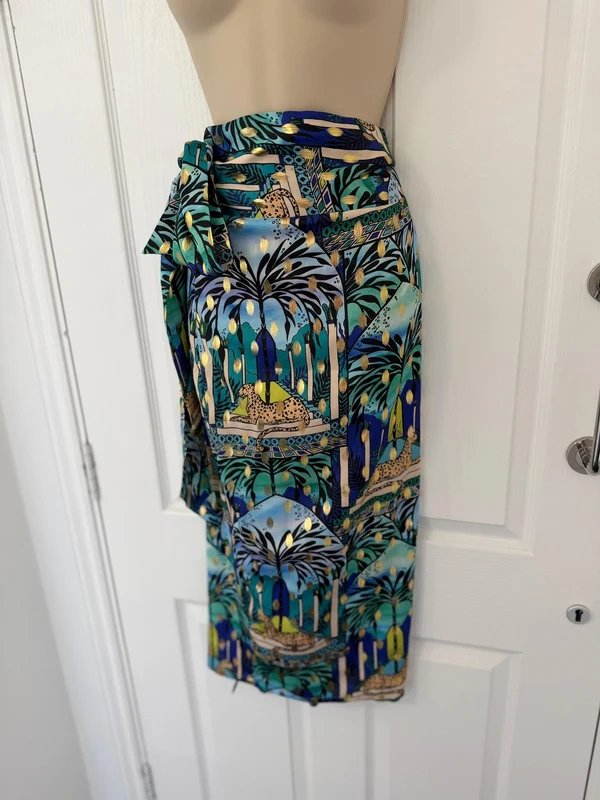 Designed with a vibrant, hand-drawn tropical jungle print featuring shades of blue, palm trees, and leopards. This skirt boasts a tie waist that can be adjusted to fit your shape.