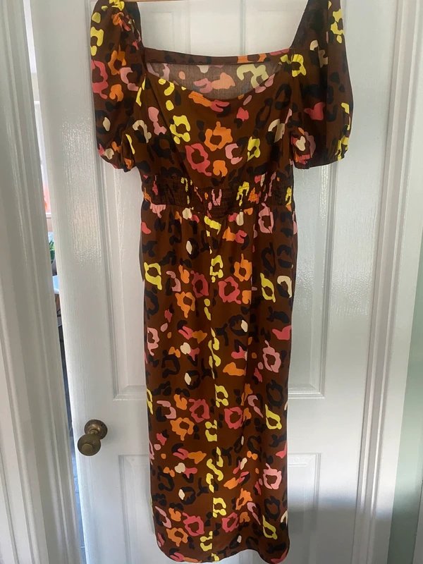 Lovely brown midi dress from Never Fully Dressed. Brand new with tags. Size 16. Features a square neckline, puffed sleeves, and a ruched waistline. Abstract pattern in orange, black, pink, yellow, and cream. Great dress for Spring.