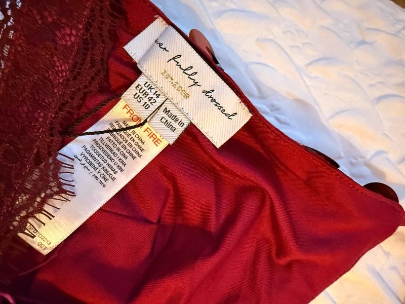 The Never Fully Dressed Burgundy Sequin Lace Trim Bra is available in sizes L.