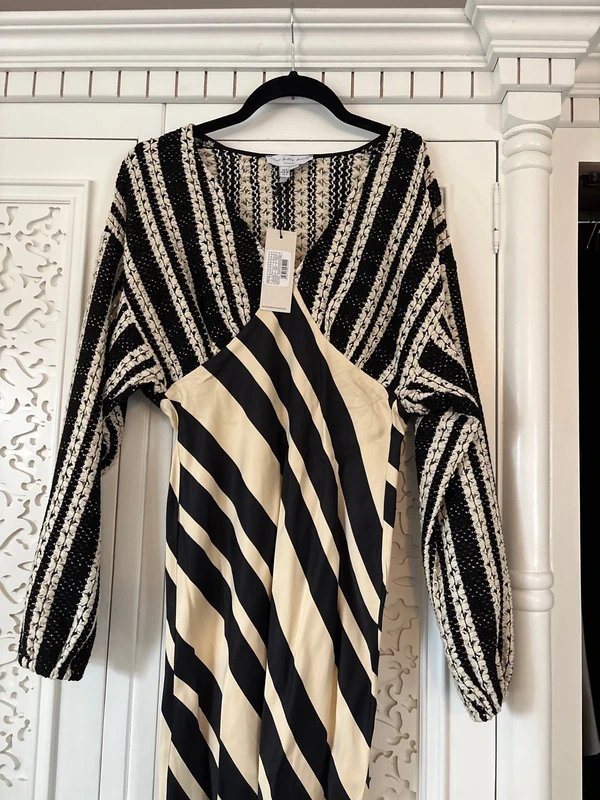 Black and cream Crochet Mix Emma Dress Petite by Never Fully Dressed. This never worn dress features a unique crochet pattern with a blend of black and cream colors. Designed with a flattering fit, it includes long sleeves and a V-neckline. Perfect for casual outings or special occasions.