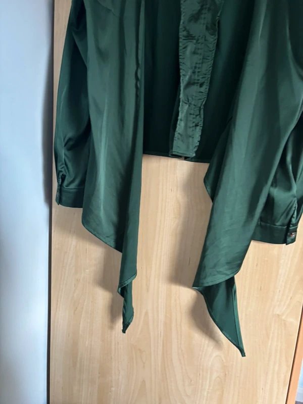Forest Green Backless Satin Shirt — the must-have occasion shirt for wedding guests, evening events, dinner parties. Designed in vibrant forest green, this backless shirt features a tie at the bottom for adjustability. Crafted from lightweight satin, it catches the light beautifully. Includes a small mark on the inside where I have used clothing tape for security but not visible when worn.