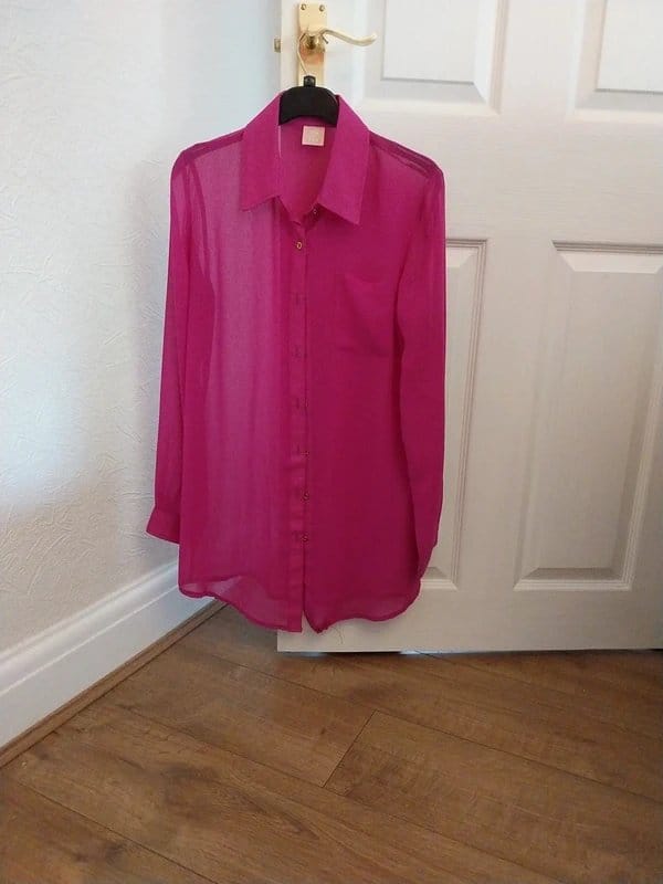 The Never Fully Dressed Fuchsia Chiffon Blouse Size M is made from chiffon.