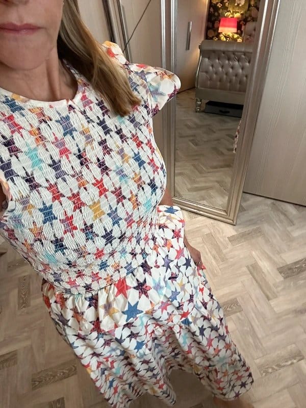 Vibrant maxi dress in a multi-coloured floral print with a gathered waist and short sleeves. Perfect for casual outings or summer events.