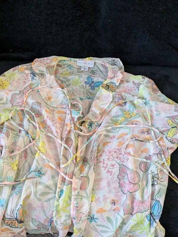 Apricot Floral Print Blouse — the perfect addition to your summer wardrobe. This long-sleeved blouse features a tie detail on the sleeves and a butterfly print that adds a touch of whimsy. Ideal for pairing with skirts or jeans for a hippy look, this floaty blouse is a versatile piece for any casual occasion. Crafted from lightweight fabric with a butterfly print, it offers a relaxed fit and a tie front for a customizable look.