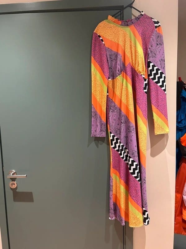 Vibrant midi dress in a multi-print design featuring full-length sleeves and a high ruffle collar. Made from satin fabric, it offers a modest cut and is true to size 14.