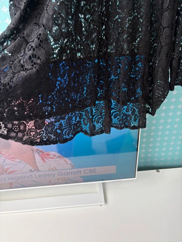 A black lace top by Never Fully Dressed, featuring a label cut out and a slightly longer back. Perfect for a touch of elegance.