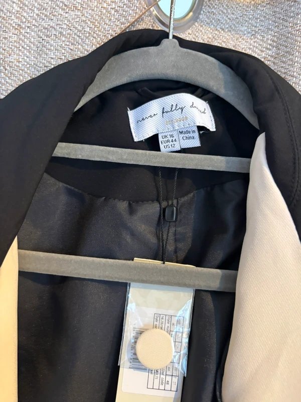Black Blazer by Never Fully Dressed. Crafted from a sleek, structured fabric, this blazer features a classic lapel collar, long sleeves, and a straight-cut silhouette. Perfect for adding a touch of sophistication to any outfit.