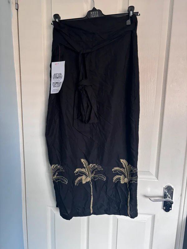 This Never Fully Dressed wrap skirt features a black and gold embroidered palm trees design. Perfect for a chic and casual look, this dress is versatile for any occasion.