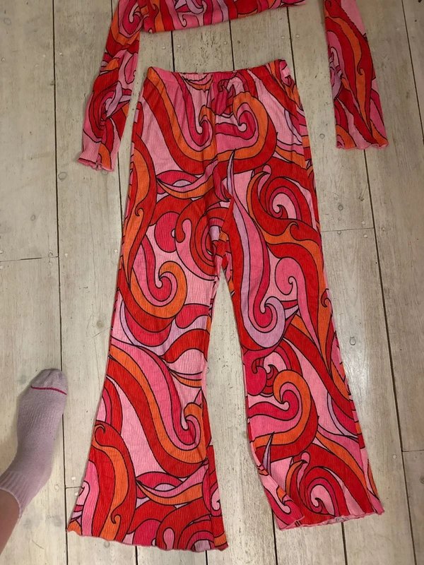 The pink and orange 1960’s design two piece set features an elastic waist for a comfortable fit. Ideal for festivals and parties, this set brings a vibrant, playful style.