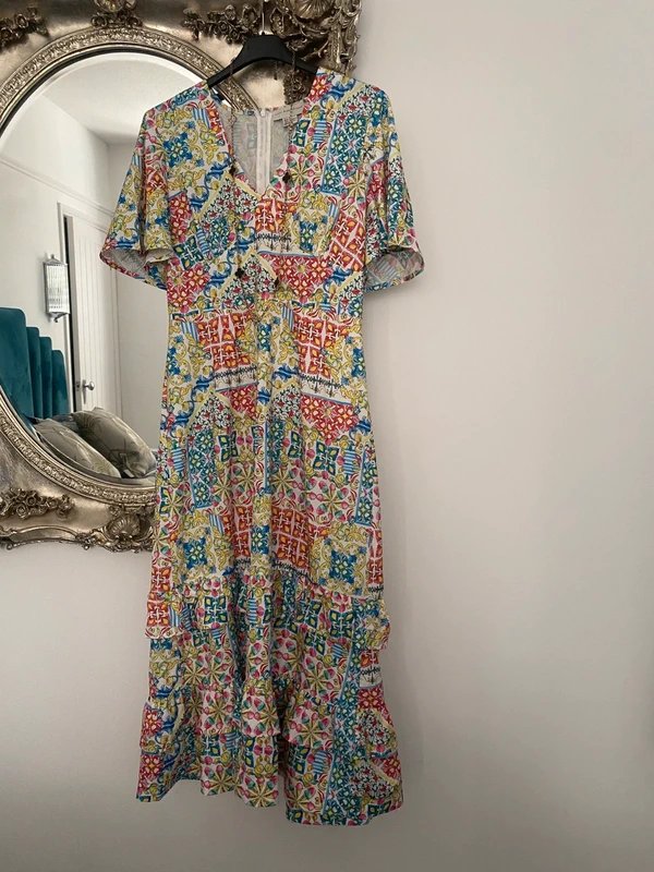 The Amalfi print midi dress by Never Fully Dressed features a flattering shape with a back zip and seam under bust area. It is perfect for a casual day out or a weekend brunch.