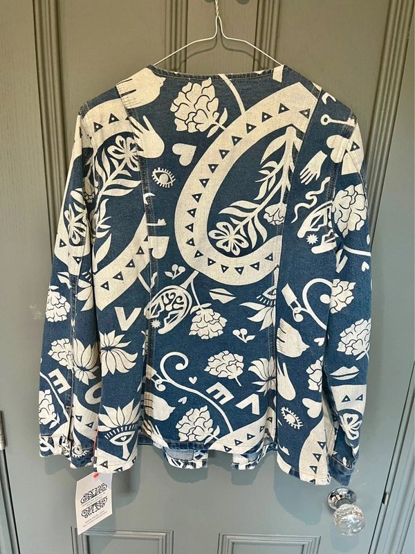 The Never Fully Dressed Printed Denim Jacket in Blue is available in sizes M.