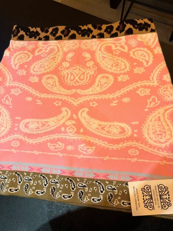 The Never Fully Dressed Bandana Knit Mini Skirt in Pink is available in sizes L.