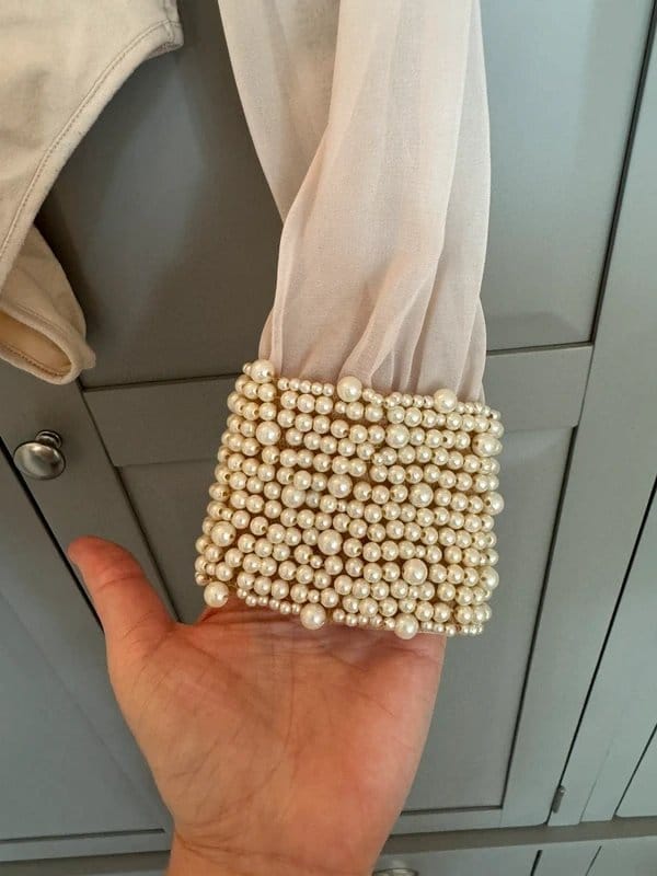 The Never Fully Dressed Beige Bodysuit with Pearl Cuffs is available in sizes M.