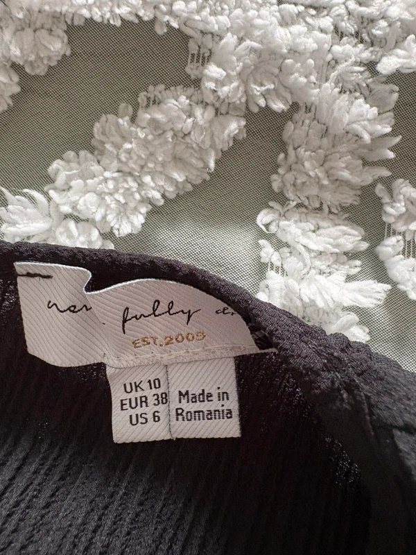 Elegant black plisse midi dress by Never Fully Dressed size 10. The dress features ruched sleeves that can be adjusted up or down, a thin tie belt, and a stretchy fabric that sits at midi length.