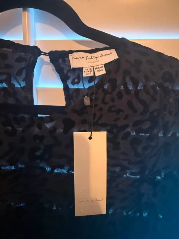 The Never Fully Dressed Black Leopard Print Midi Dress is available in sizes S.