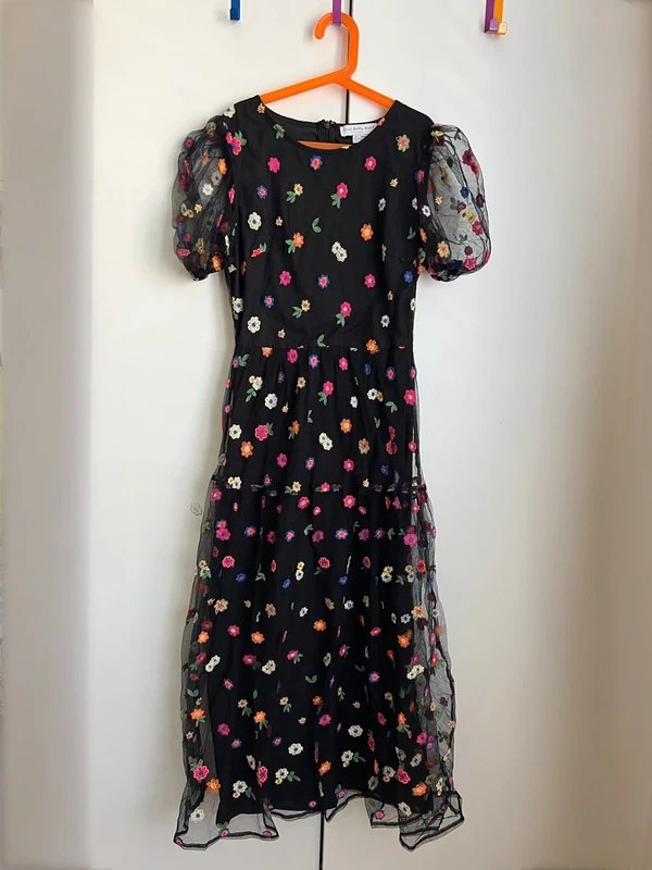 The Never Fully Dressed Floral Embroidered Midi Dress in Black is available in sizes S.