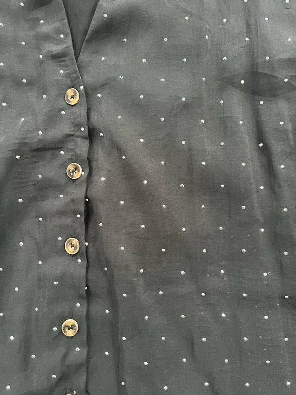 Elegant long sleeve, V-neck black shirt with balloon sleeves and small silver embellishment. Made from a blend of 84% Lyocell and 16% Polyester, it offers a sophisticated and lightweight feel.