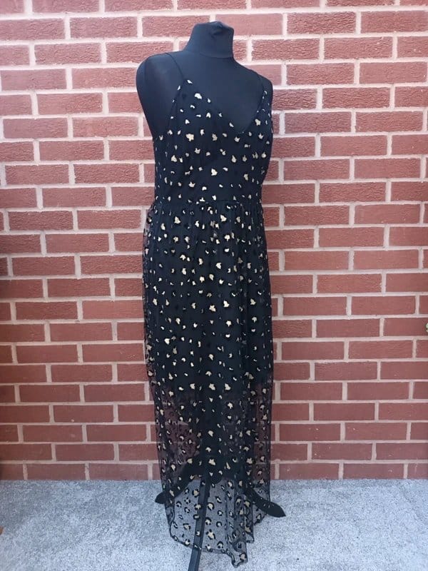 Striking black and gold leopard print midi dress with a sheer mesh overlay. Features a delicate strappy neckline and a fitted bodice. Perfect for evening events or special occasions.