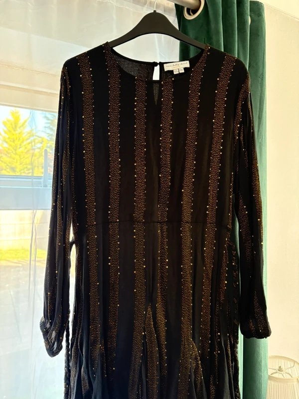 Elevate your evening wear with this black mini dress. Featuring vertical stripes of gold sequin embellishments, long balloon sleeves, a waist tie for an adjustable fit, and a keyhole button closure at the back.