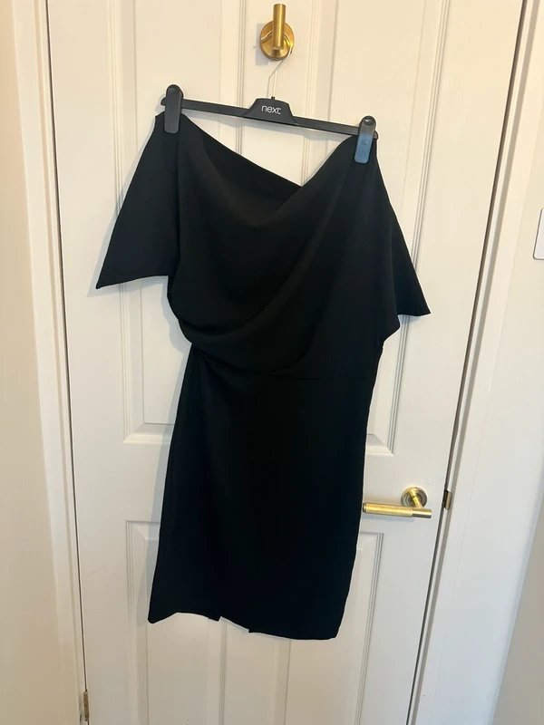 The Never Fully Dressed Black Crepe Off-Shoulder Dress is available in sizes S.
