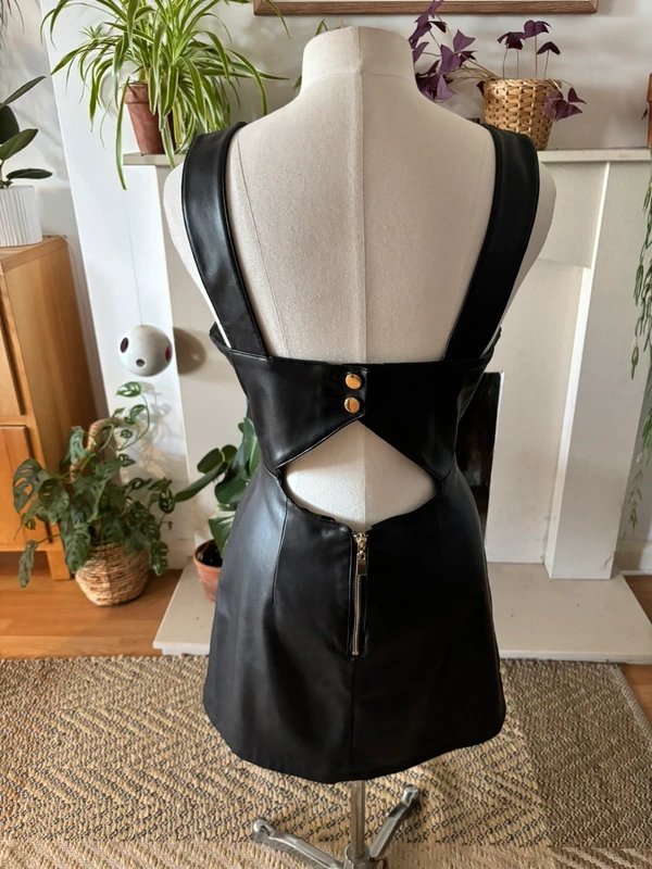The Never Fully Dressed Vegan Leather Mini Dress in Black is available in sizes S.
