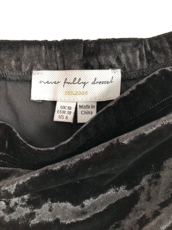 Never Fully Dressed black velvet dress. Can be worn as a dress or full-length skirt. Features a split at the back, adding a touch of sophistication. Versatile for various occasions.