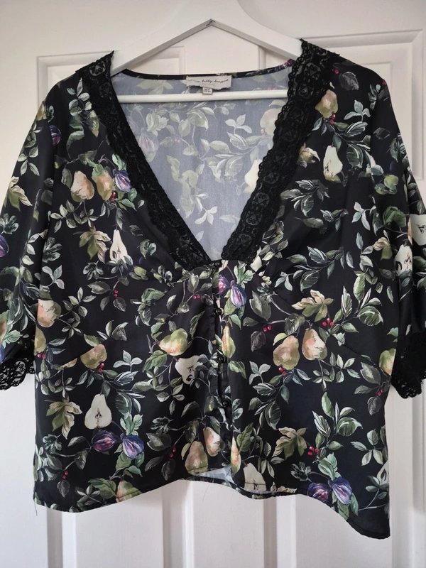 The Never Fully Dressed Floral Print Lace Blouse in Black is available in sizes L.