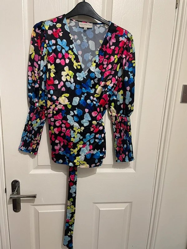 This vibrant V-neck wrap style blouse features a black background adorned with red, pink, blue, yellow, and green prints. It boasts long sleeves that are slightly puffed with deep ruched cuffs. Perfect for adding a pop of color to any outfit.